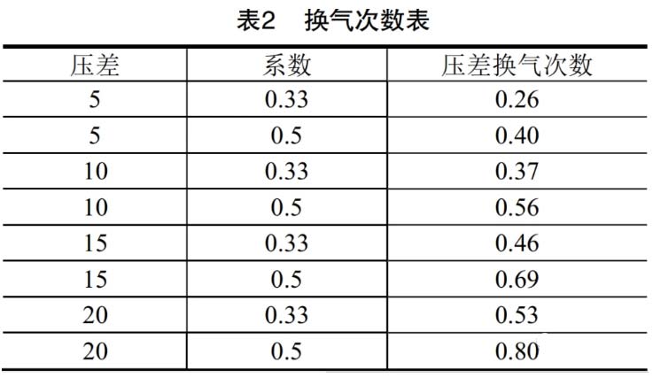 有些项目仅仅按照换气次数法计算渗透风量(见表1、表2),而忽略其他因素,笔者认为合理的方法应是综合计算房间围护结构渗透风量和门的渗透量;这样才能保证正确的房间压差平衡和变风量阀选型,有利于正确的风机风量选型。