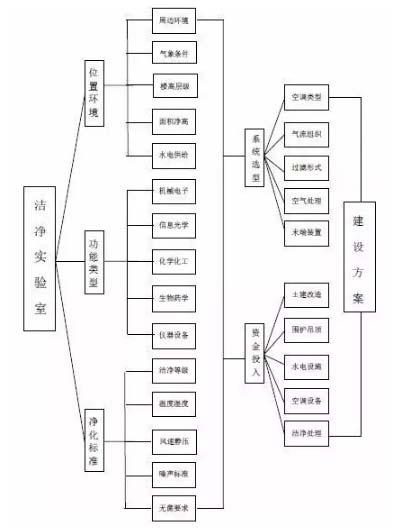 在选型实际中,人们往往会根据资金、能耗来选择空调的类型,忽略了选型的根本是为了满足需要,满足净化标准要求。在选型之前,一定要领会净化实验室的用途和实验内容、实验仪器设备、实验对象对空气参数和环境要求的具体事项,然后有的放矢地提出有针对性的净化标准,应该考虑的内容要包括:实验室的面积、楼层高度、实验室的总高度和净化实验室围护后的高度;希望达到的温度、相对湿度、风速、静压、静压差等;实验室内要求的洁净等级、噪声标准、无菌要求等等,综合考虑这些因素后,提出一个适宜的资金要求,从而确定空调通风系统的具体形式和类型。整体建设洁净实验室的过程如图1-1方框图所示。